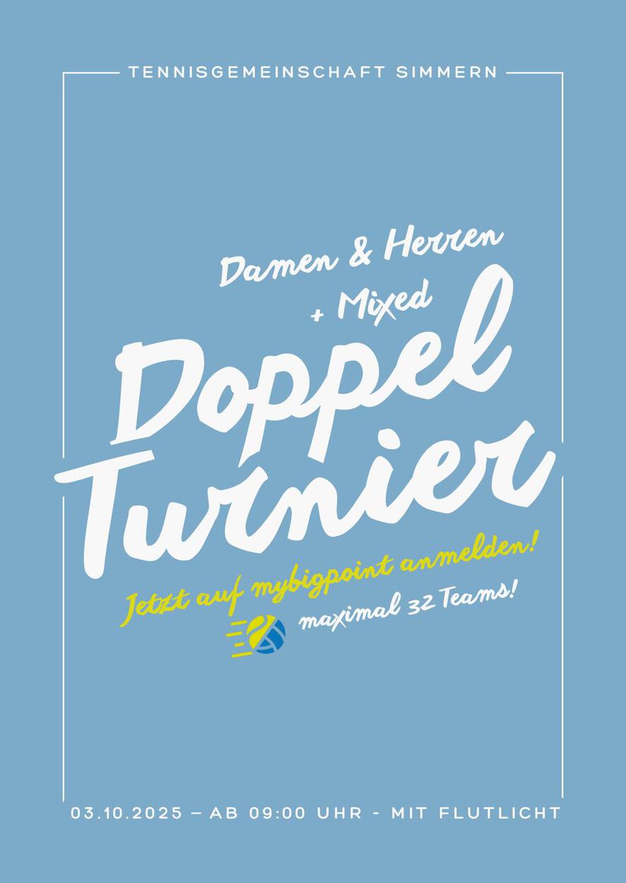Am 3. Oktober 2025 lädt die Tennisgemeinschaft Simmern alle Tennisbegeisterten herzlich zu einem besonderen Highlight ein: unserem Doppelturnier für Damen, Herren und Mixed-Teams.